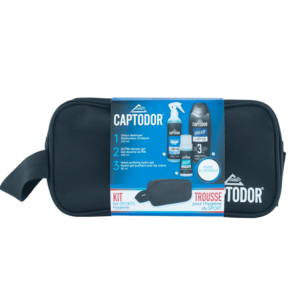Includes: A toiletry bag, 1 Shower gel Ultra, 1 Captodor Odor Destroyer 240ml and 1 Hand purifying Hydro-Gel